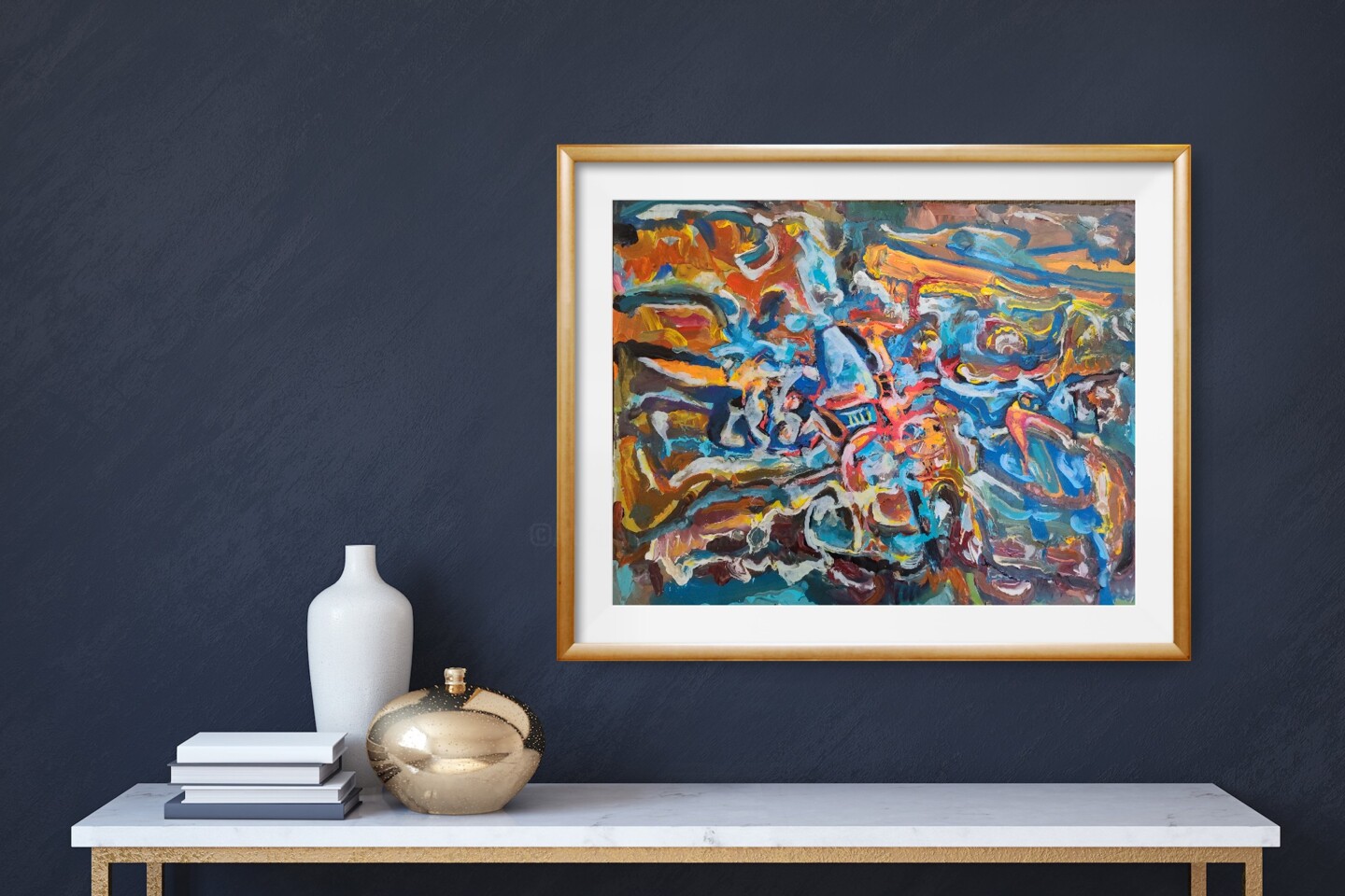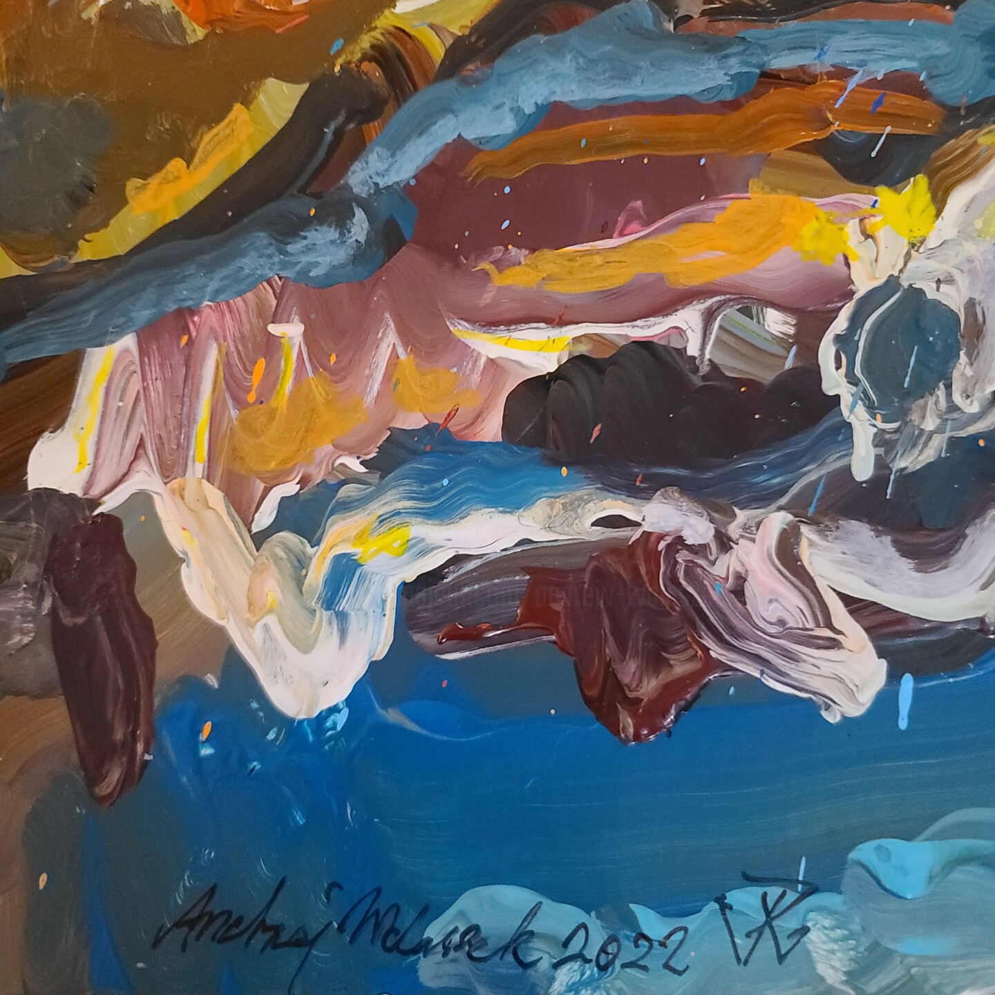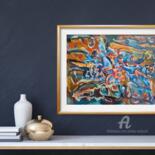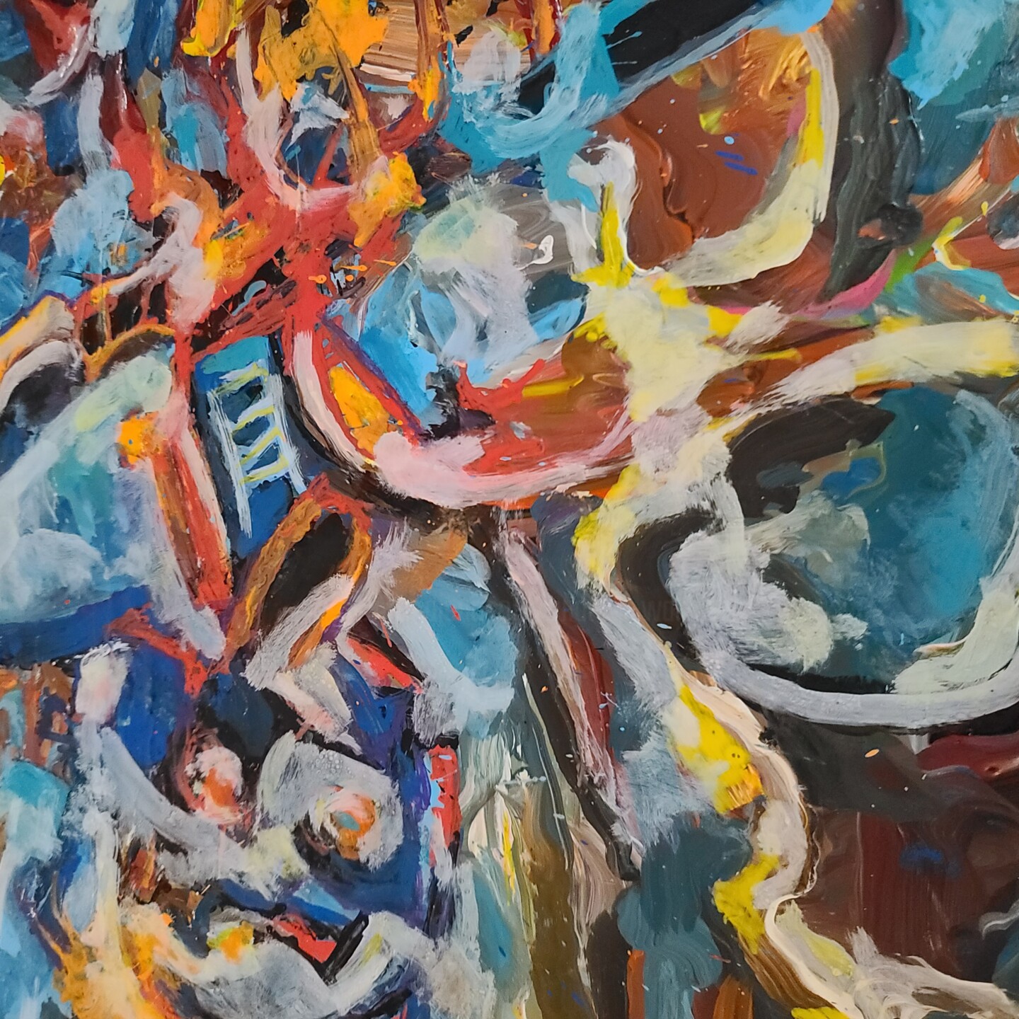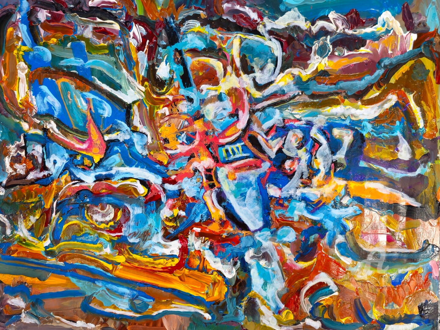 This non-objective abstract painting was started outside on my porch. I used acrylic paints and painted in the gestural abstract expressionism style. When the air temperature reached 105F, I was forced to move inside and finished the painting using acrylic pens and small brushes. I have also switched from a gestural to a figurative painting style, influenced by the 45th anniversary and my inner needs.